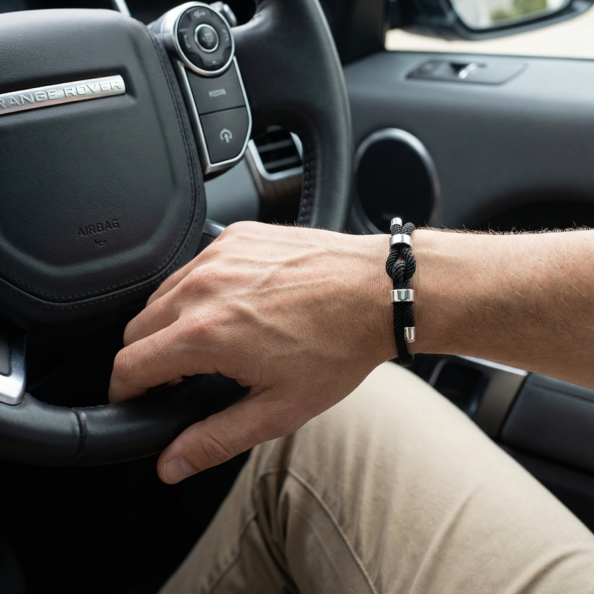 Enhance your casual or sophisticated look with this stylish black rope bracelet, featuring sleek silver accents. Crafted from durable, high-quality materials, this bracelet offers a comfortable fit for everyday wear. Its minimalist design, highlighted by a distinctive knot detail and silver clasps, makes it a versatile accessory that adds a refined touch to any outfit.