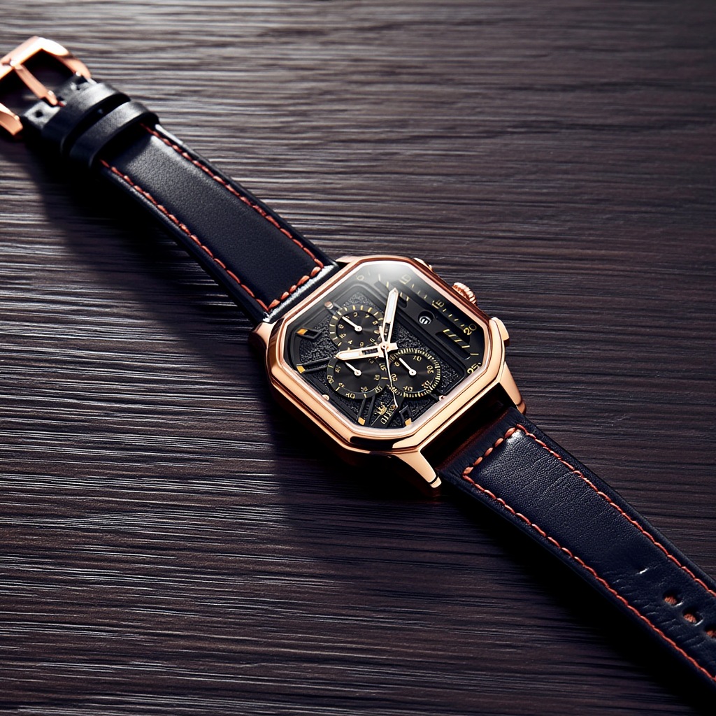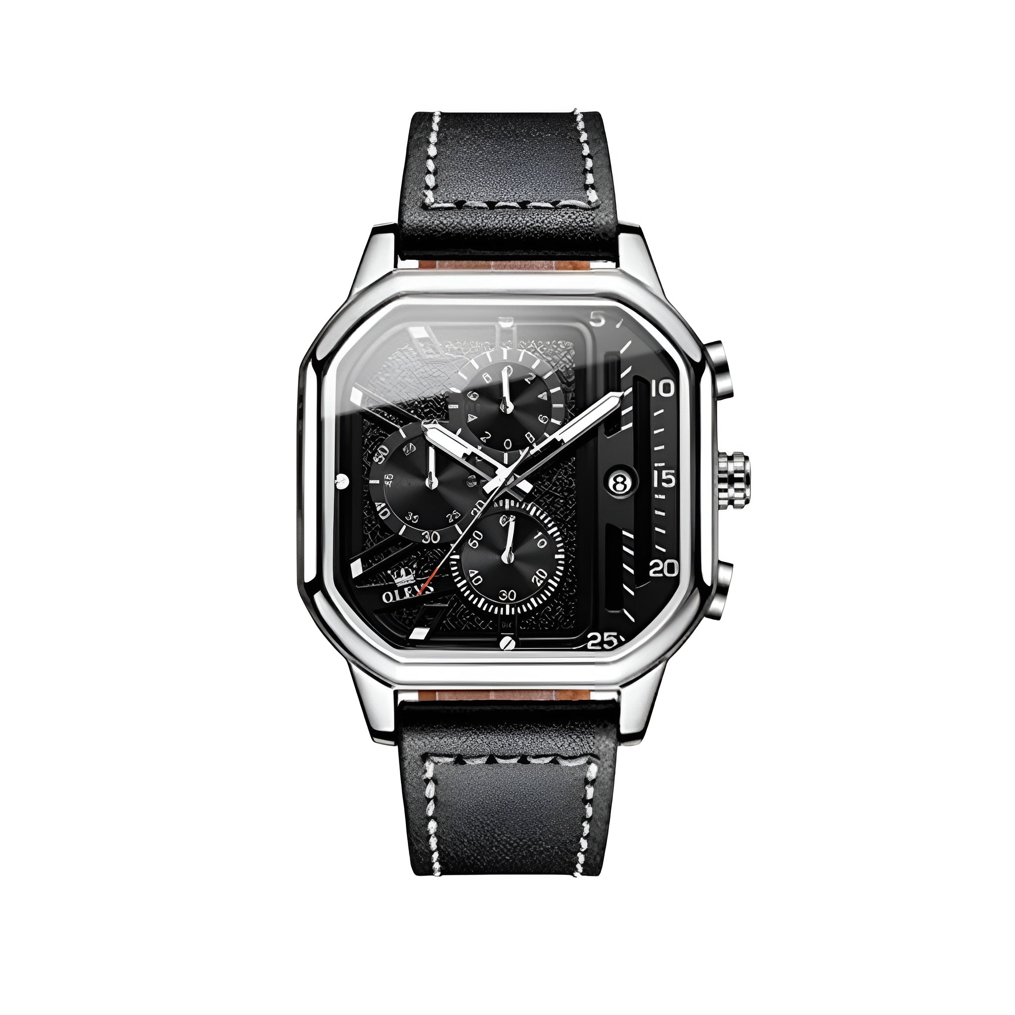 Elevate your style with the OLEVS 9950 Men's Square Watch, featuring a distinctive design and exceptional craftsmanship. The bold square stainless steel case is complemented by a sophisticated black leather strap, offering both comfort and durability. Its striking dial showcases a modern chronograph layout with three sub-dials, providing precise timekeeping and added functionality.